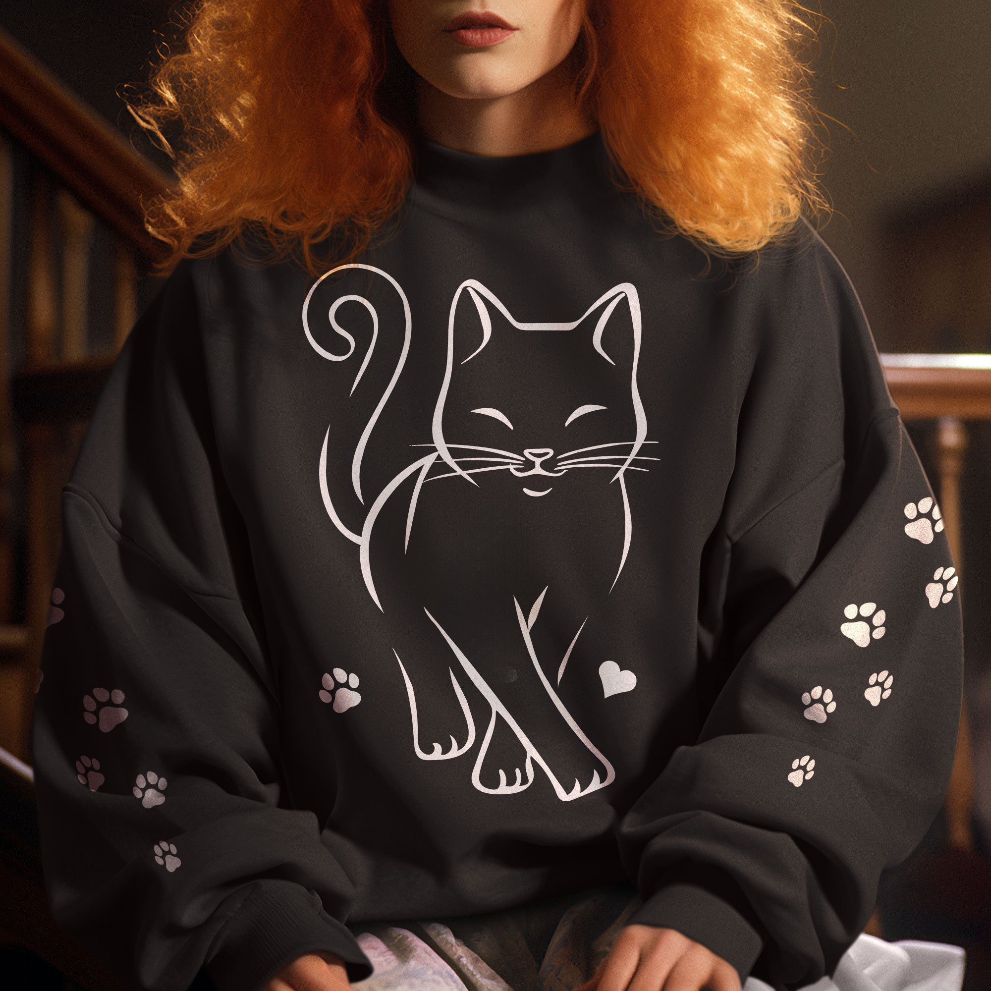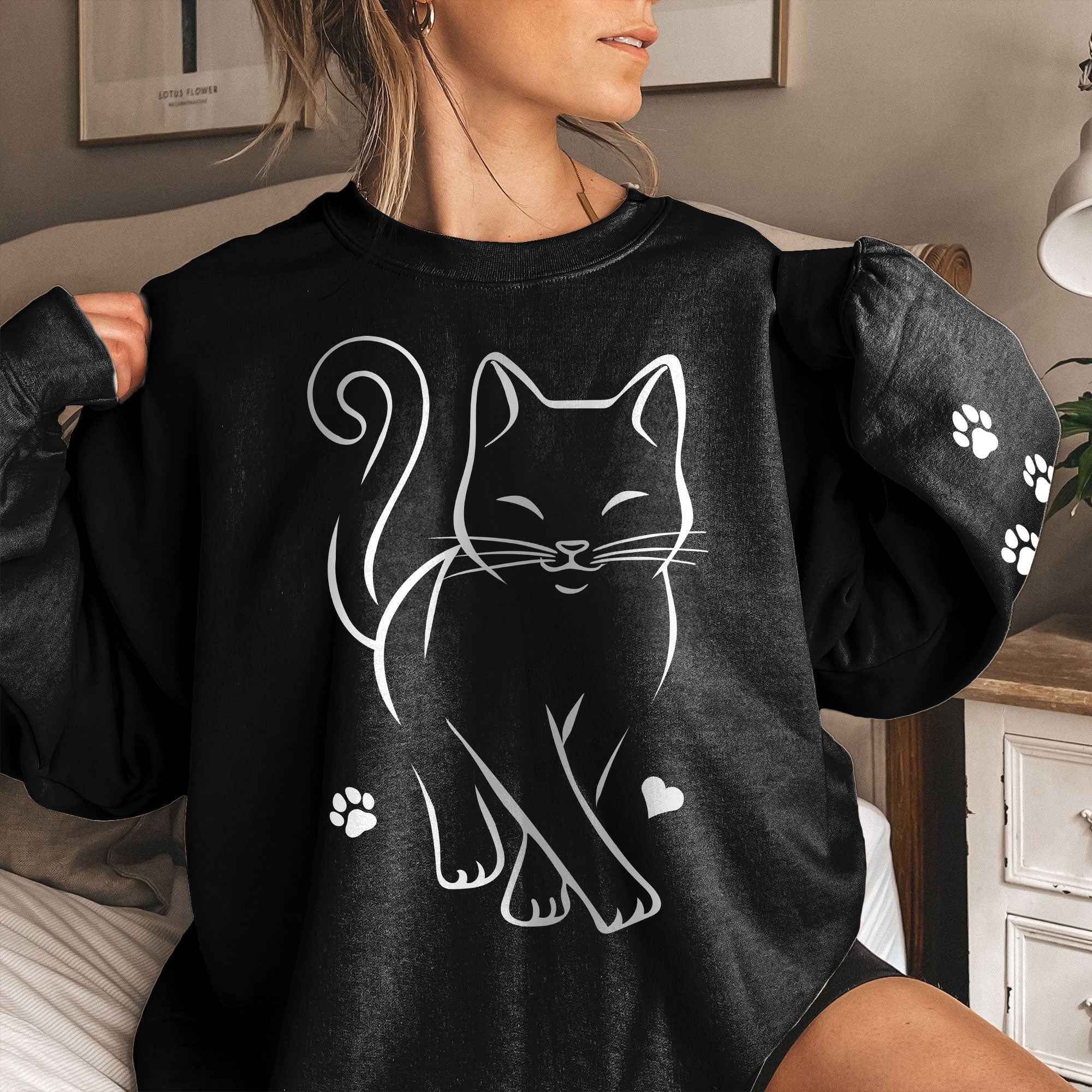 The sweatshirt features an endearing image of a charming cat with its paw resting on the sleeve. It’s not just a garment; it’s a statement of your love for these wonderful creatures. Crafted with care and attention to detail, it ensures both comfort and style.