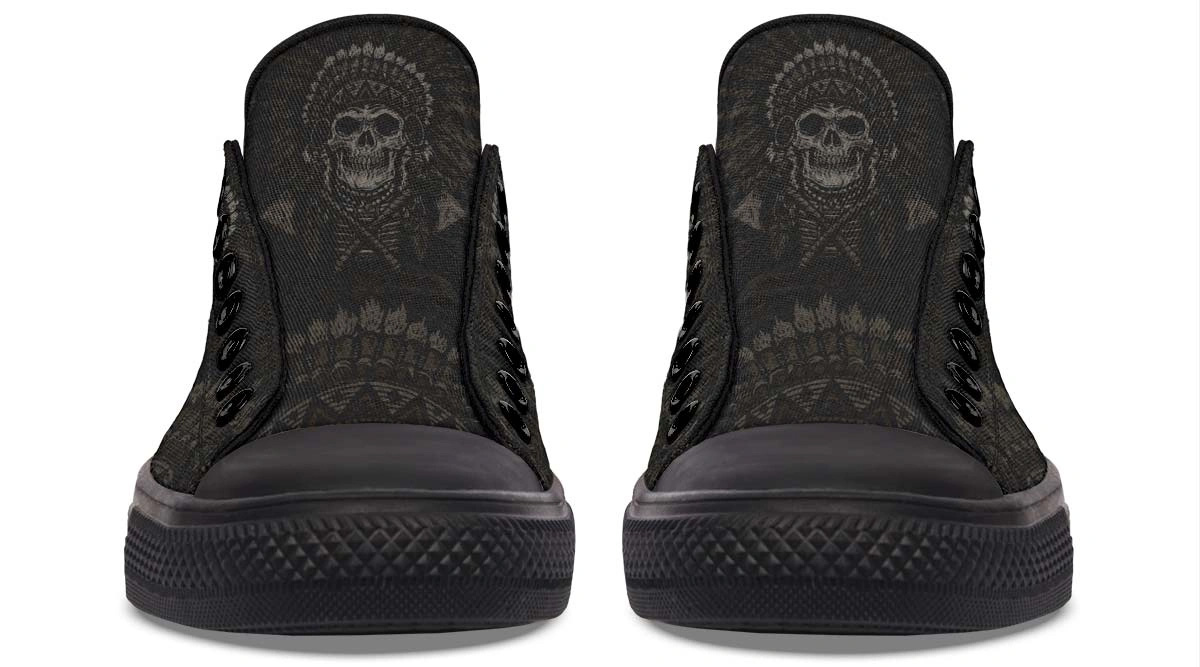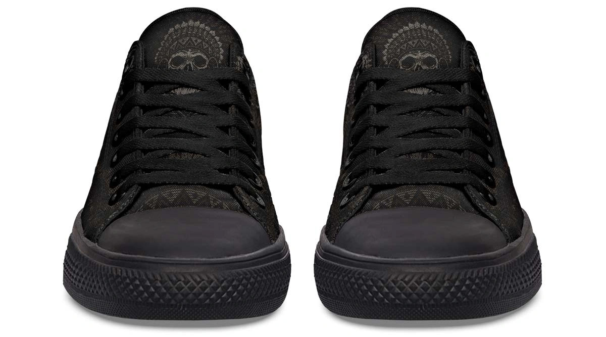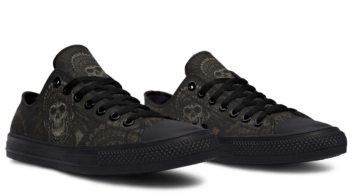 Elevate your street style with these Native American skull art low top sneakers. Combining traditional cultural motifs with a modern edgy aesthetic, these sneakers feature a bold skull design that stands out from the crowd. Built for both comfort and durability, they offer a snug fit and breathable feel for long hours of wear. Perfect for fashion-forward individuals looking to add a unique flair to their footwear collection. Keywords: tribal skull shoes, urban art sneakers, native inspired footwear, stylish low tops.
